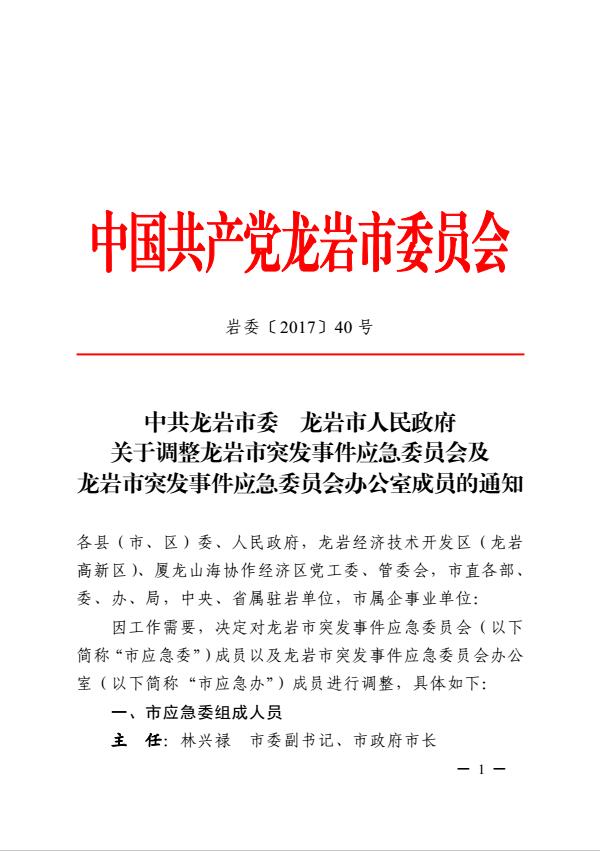 市委關(guān)于調(diào)整龍巖市突發(fā)事件應(yīng)急委員會及龍巖市突發(fā)事件應(yīng)急委員會辦公室成員的通知(巖委【2017】40號)