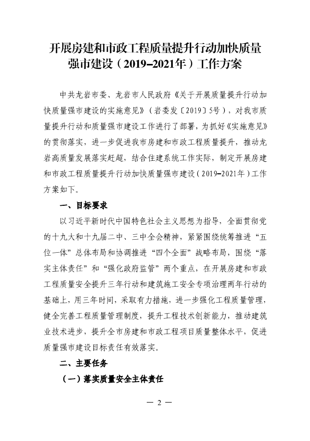 龍巖市住房和城鄉(xiāng)建設(shè)局關(guān)于印發(fā)開展房建和市政工程質(zhì)量提升行動(dòng)加快質(zhì)量強(qiáng)市建設(shè)(2019-2021年)工作方案的通知